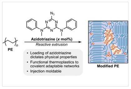 The increasing consumption of polyethylene (PE) is an important concern for society because the rate of PE recycling remains low compared to the scale of PE production. There is thus great interest in strategies for revalorizing PE waste. In this context, our group recently reported an approach for transforming PE into nanostructured covalent adaptable networks (CANs) with azidotriazine grafting agents using reactive extrusion. These CANs feature polyazane cross-links that undergo thermomechanically activated exchange reactions, permitting the material to flow when subjected to high temperature and strain. Herein, we exploited this chemistry to develop modified PE materials with intriguing thermomechanical properties and exceptional processability. A family of compositions was prepared by reactively extruding PE with varying amounts of the azidotriazine grafting agent, and the resulting materials were studied using a combination of electron microscopy, small-angle X-ray scattering, calorimetry, rheometry, and mechanical testing. As the loading of the azidotriazine grafting agent was increased from 0.05 to 1.0 mol %, the materials transitioned from being thermoplastic-like to thermoset-like, revealing a balance of mechanical properties, melt strength, and high-temperature creep resistance. Surprisingly, all samples─even the CANs prepared with high loadings of the azidotriazine─could be easily shaped by injection molding. We believe that this approach is a promising, industrially relevant way to enhance the thermomechanical properties of polyolefins.