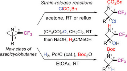 Substituted azetidines are privileged heterocyclic scaffolds in medicinal chemistry and have become synthetic targets of high interest in recent years. With the goal of developing a new access to azetidines incorporating the pharmaceutically relevant trifluoromethyl group, the reactivity of 2-(trifluoromethyl)-1-azabicyclo[1.1.0]butanes was investigated in polar strain-release reactions. By using benzyl chloroformate or trifluoroacetic anhydride as reacting partners, diversely substituted 3-chloroazetidines, 3-substituted azetidines and azetidin-3-ols bearing a trifluoromethyl group at C2 could be readily synthesized. In addition, palladium-catalyzed hydrogenolysis reactions provided an entry to cis-3-aryl-2-trifluoromethyl azetidines.
